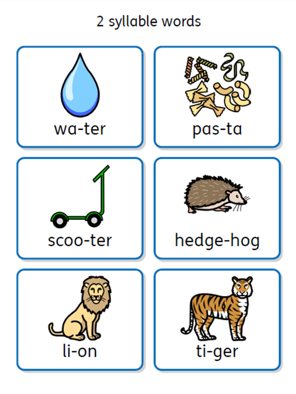 Practice clapping out the number of syllables in a word. Use a mix of words that have 1 syllable (boat), 2 syllables (tractor), 3 syllables (aeroplane) and 4 syllables (helicopter). Clap out the syllables, bang them on a toy drum (or pan) or count them on your fingers.