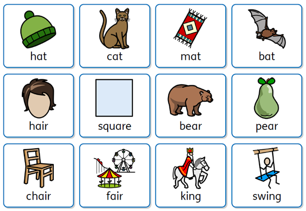 e.g. Bun and sun – “Yes they rhyme” – Chair and ring – “No they don’t rhyme”