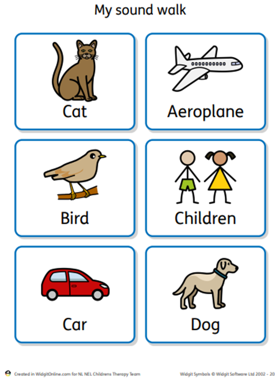 Go on a sound walk and find different things that makes sounds e.g. bell (ding-dong), telephone (ring ring), aeroplane (nneeoow), emergency vehicles (nee naw), dog barking (woof woof). Use Picture Resource Set 1 for Sound Walk pictures to take with you.